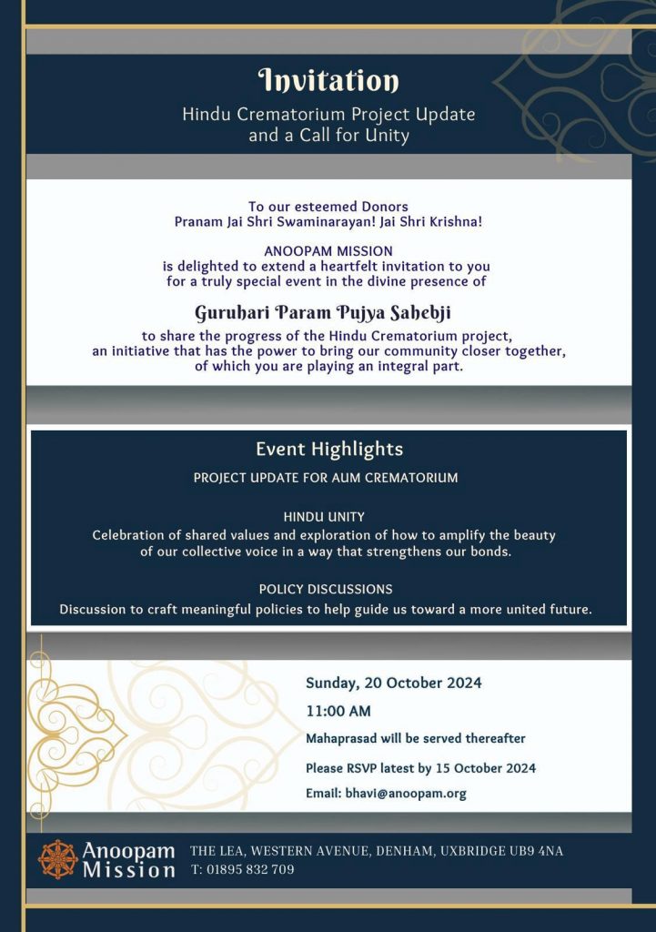 On Sunday 20th October 2024, An update was provided on the first ever purpose-built crematorium for Hindus, Sikhs and Jains in the UK, followed by discussion on Hindu unity.
